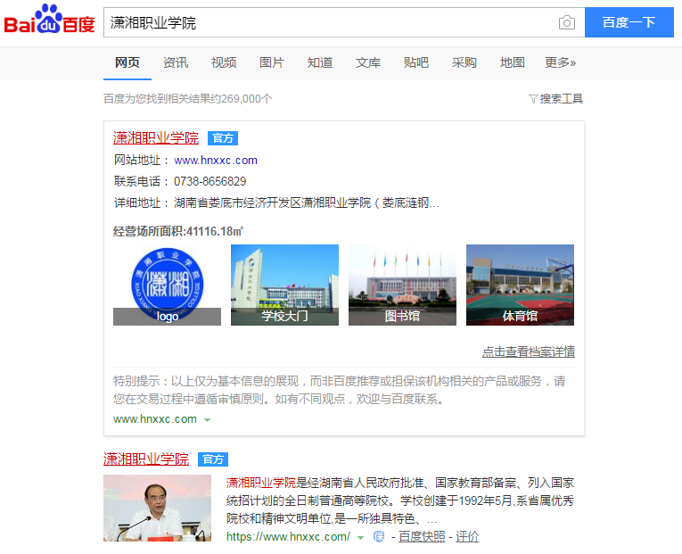 潇湘职业学院的官网此前已经在百度标注了免费的“官方”标识,但学校希望能在百度上获得更好的展现样式,故与我司合作了百度的实地认证。通过第三方上门进行相关资质核验后, 潇湘职业学院成功上线了实地大卡。实地大卡内直观展示了学校的官网、地址、电话等信息,更重要的是展示出了学校的实景图片。