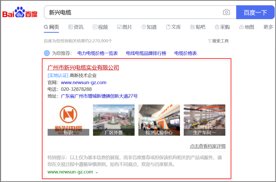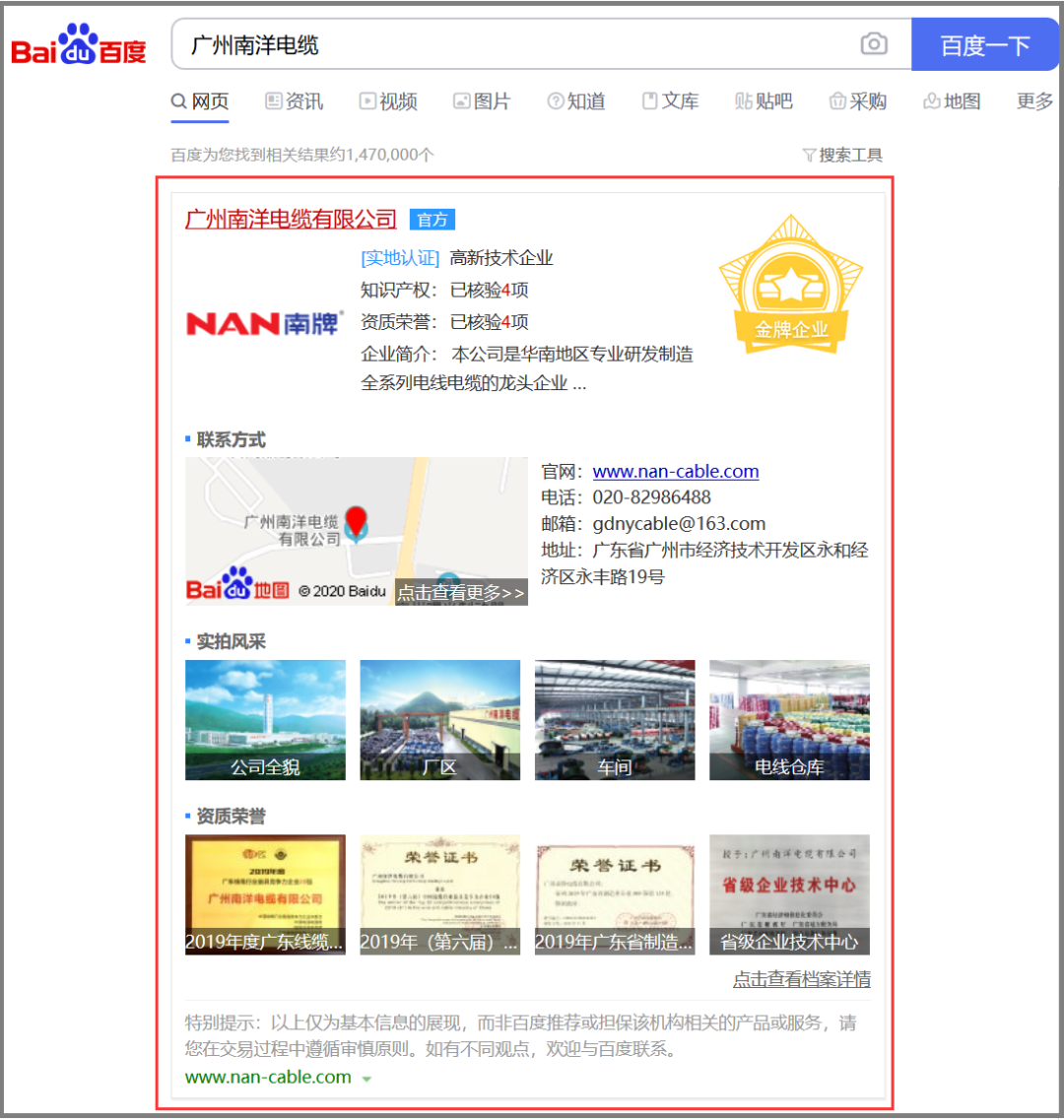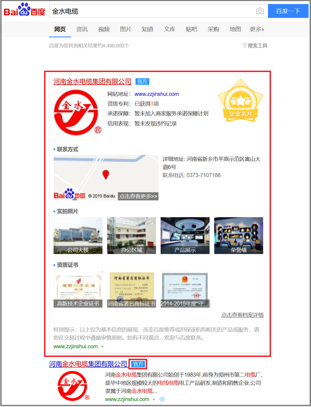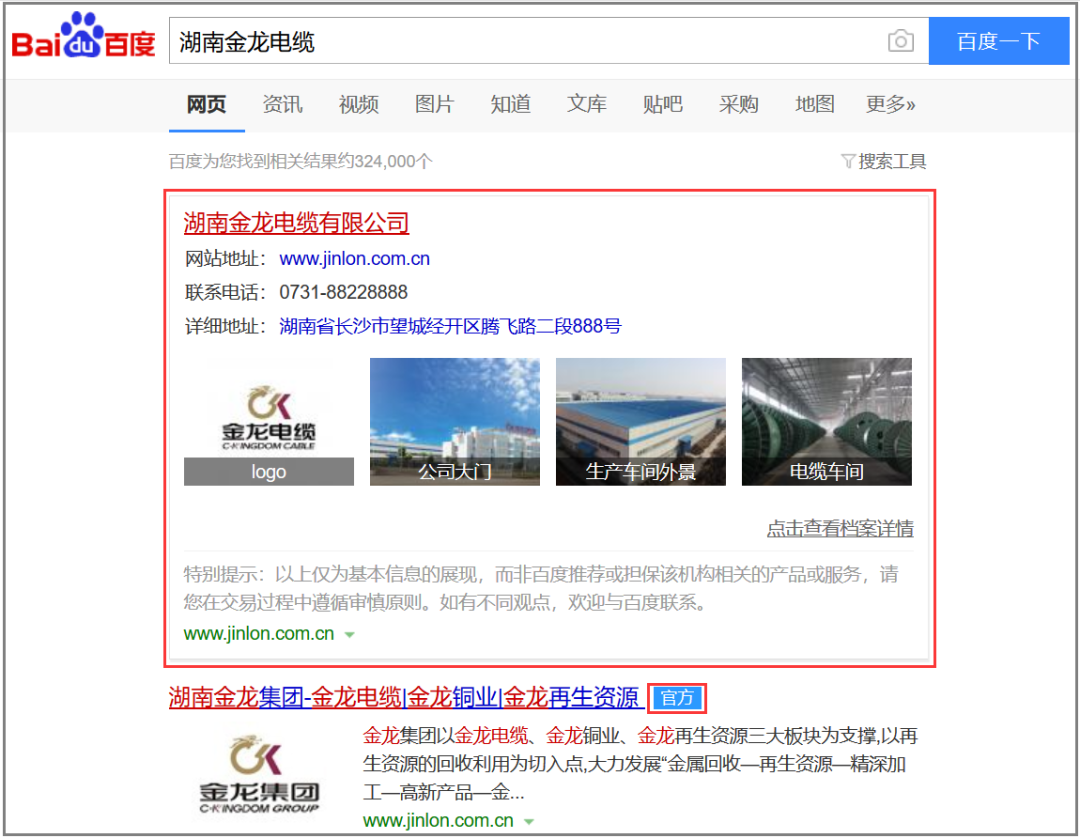 通过在百度搜索页、百度企业名片页增加客户品牌在互联网的曝光度,方便网民快速了解,助力客户更精准快捷的获得网民信任。